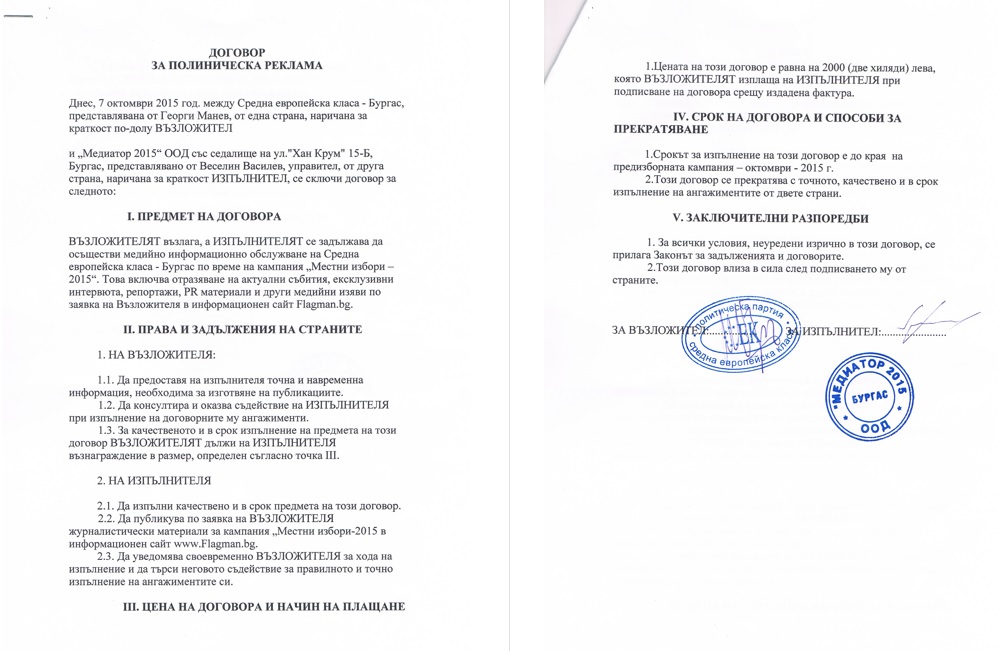 Договор за политическа реклама за "Местни избори - 2015" между СEK - Бургас и "Медиатор 2015" ООД