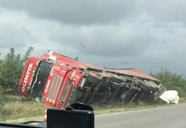 Автор: Николай ПетровТИР се обърна край Сливен, сигнализират читатели на Флагман.бг. Катастрофата очевидно е самостоятелна, а тежкотоварното возило е в канавката на отбивката от автомагистралата към Града на стоте войводи. Няма пострадали, но е разпиляна цялата продукция, превозвана в камиона.